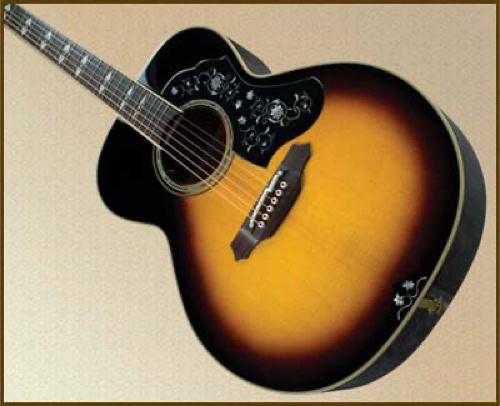 Shown below is the LTD 2009, a solid Spruce top NEX body in Sunburst with solid Mahogany back/sides all in a gloss finish. A laser etched shell pick guard, shell tail trim and shell fretboard round out the look.
