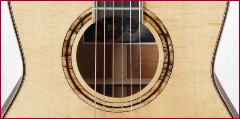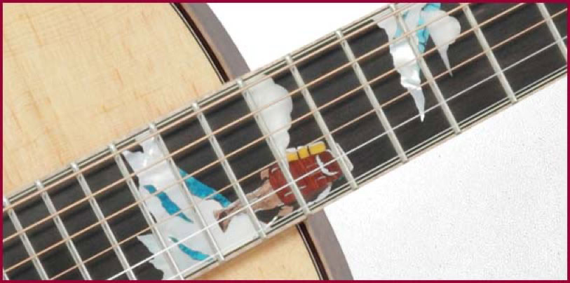 Shown below is the LTD 2013-SE, a 12-fret New Yorker (Parlor) size guitar with solid Bearclaw Spruce top and solid Koa back and sides. An intricate Climber motif adorns the fretboard and headstock.
