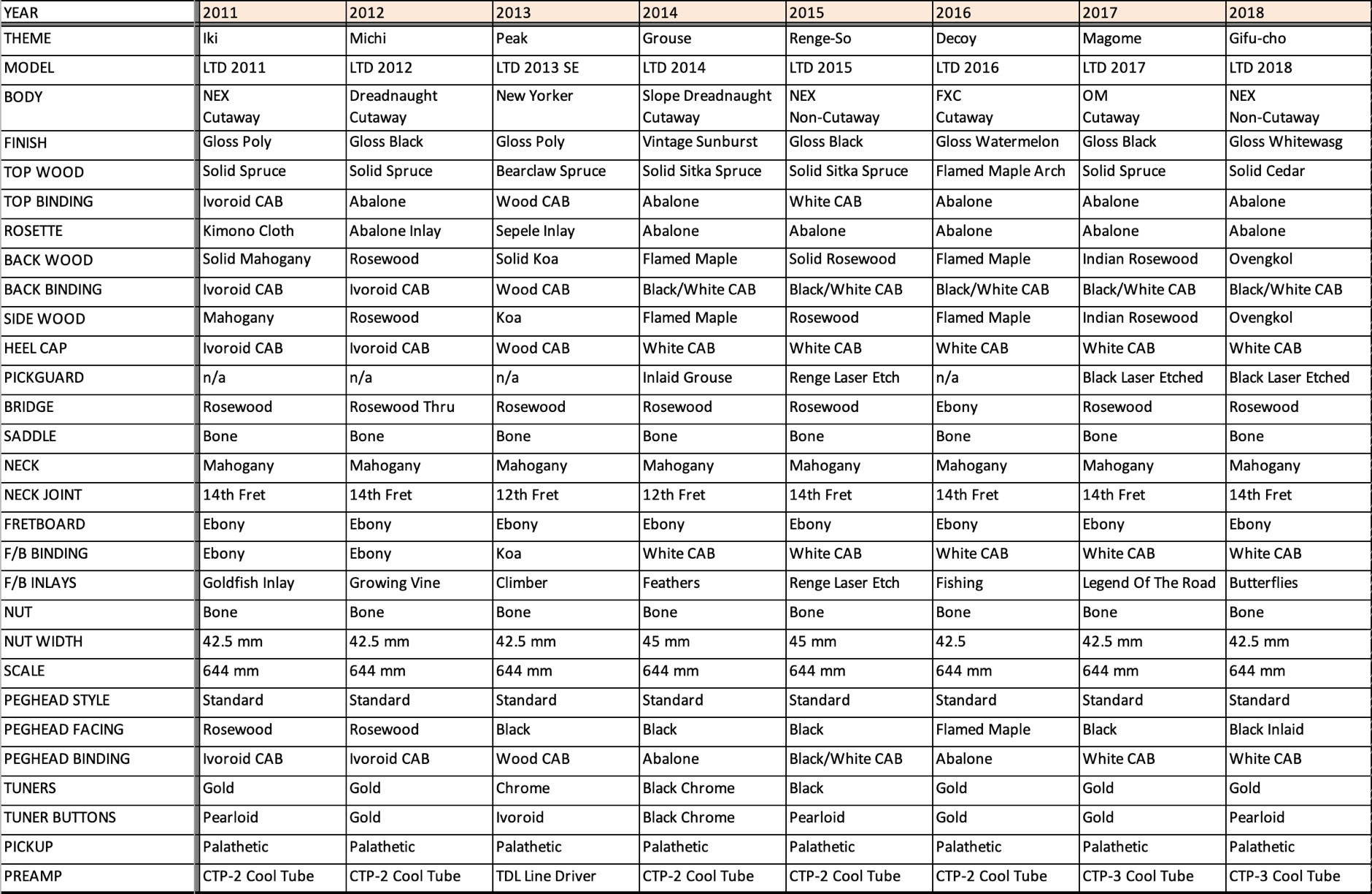 Takamine LTD Model Specifications
